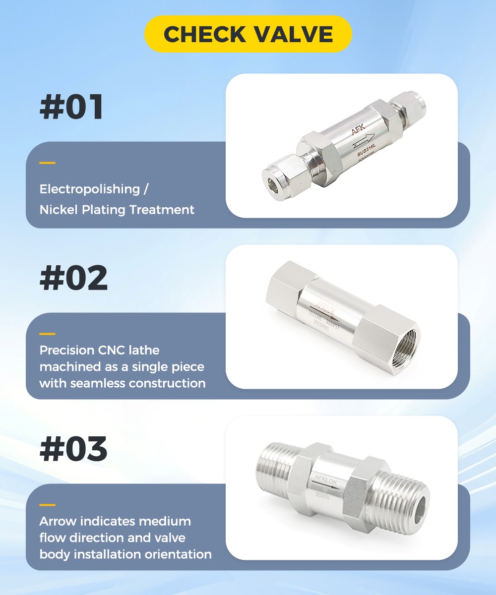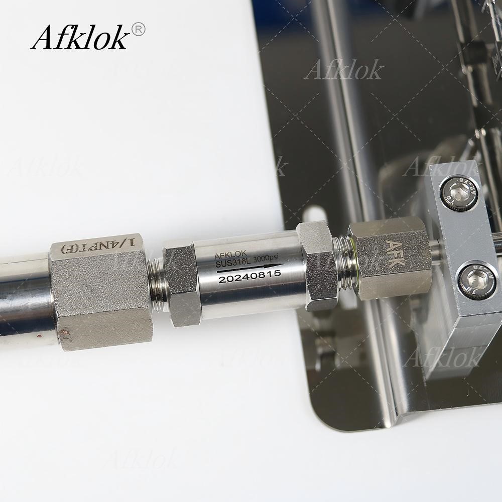 In terms of material selection, all AFK check valves are made of SS316L stainless steel. This material boasts excellent corrosion resistance, high-temperature resistance, and structural stability. Compared to ordinary stainless steel, it effectively resists corrosion from harsh environments such as acids, alkalis, and humidity, preventing sealing failures caused by material aging and significantly extending product lifespan. It is particularly suitable for complex scenarios such as the transmission of corrosive gases. Furthermore, to ensure the quality of every product, AFK check valves undergo 100% rigorous factory testing before shipment, comprehensively checking core indicators such as sealing performance and pressure control accuracy. This prevents substandard products from entering the market, providing customers with reliable and trustworthy product assurance.uncontaminated gas purity and extends valve lifespan, perfectly meeting the long-term needs of laboratories and engineering sites roving ease of use.